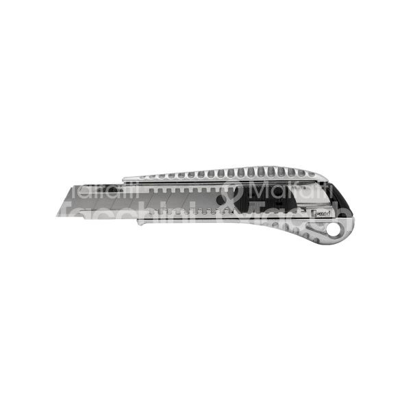 CUTTER Corpo in alluminio pressofuso Rivestimento antiscivolo in morbida gomma sul retro Sistema autobloccaggio della lama a scatto Pulsantedi controllo movimento della lama Dimensione lama 100 x 18 mm (8 stacchi) Lunghezza cutter 155 mm